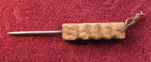 Les branches de Pin Rouge prélevées provenaient des branches basses les plus larges de l'arbre, de celles dont il faut le plus souvent débarrasser l'arbre en croissance. L'écorce est ôtée, à l'aide d'un canif. Ensuite l'outil est façonné, par petites entailles répétées, jusqu'à obtenir la forme désirée. Attention, la pointe de l'outil peut être aussi pointue et dangereuse que celle d'un poignard. Seul un fil moins aiguisé le différenciera d'un couteau à lames métalliques.