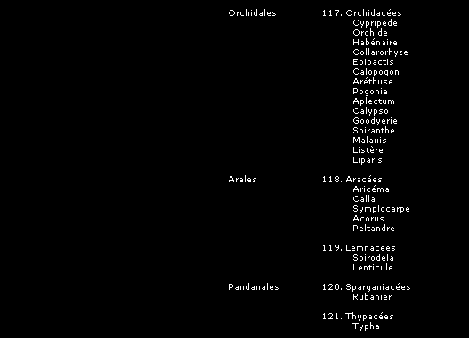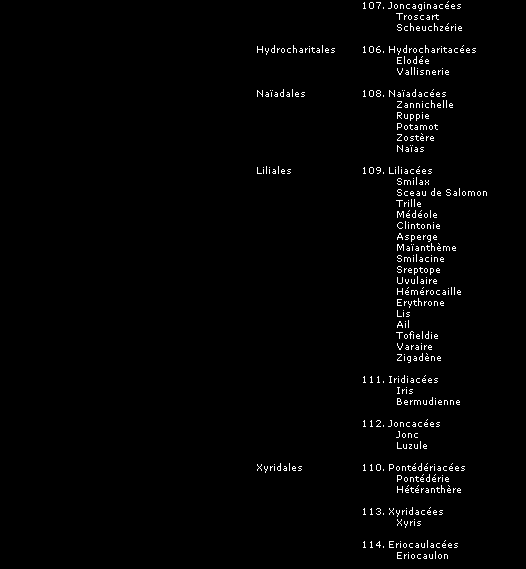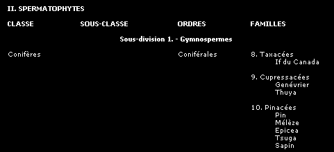 La classification que nous présentons ici, comme toutes les tentatives pour ordonner et définir les groupes de plantes et leurs relations entre elles, peut être sujette à des modifications, mais donne une image fidèle du synopsis établi par le Frère Marie-Victorin dans son ouvrage "La flore laurentienne", assurément le plus exhaustif et le plus remarquable ouvrage consacré à nos espèces québécoises.