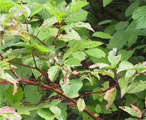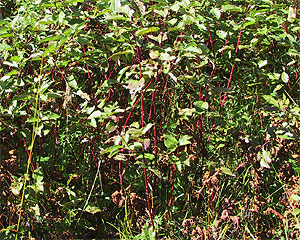 Cette plante, ou plutôt cet arbuste, est celui qu'en hiver on reconnait le mieux, car ses tiges rouges vif sombre, dénudées de leurs feuilles, surgissent hors de la neige en grands bouquets assez denses. Ces tiges qui sont lisses, très compactes, sont couvertes de petits points gris, et d'onglets durs qui ressemblent à des griffes d'animaux. Ses fleurs sont d'une couleur jaune-blanc, elles sont petites, d'une texture laineuse et leur cime est en corymbe. Elles donnent de petits fruits qui sont des baies de couleur bleu vif.