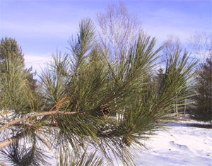 Ce qui frappe le regard au premier abord, c'est la vivacité du vert de ses frondaisons et le rouge de son tronc écaillé. Ses aiguilles, qui peuvent atteindre dix-sept centimètres de longueur, poussent en paires. Peu à peu, lors de sa croissance, le Pin Rouge perd ses branches les plus basses, jusqu'au moment où il s'en défait à l'âge adulte.