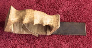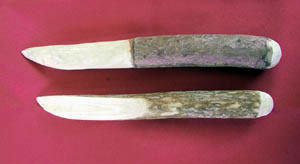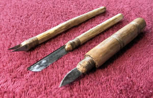 Une autre série de couteaux a été réalisée avec des lames de canifs "exactos", fixées en parallèle comme le montre l'illustration et liées avec du sinew. Ce type de couteau, à double lames identiques, droites d'un côté, en pointe de l'autre, est utilisé en vannerie, pour découper des lamelles de tiges de grosseurs toujours égales.