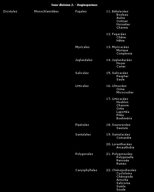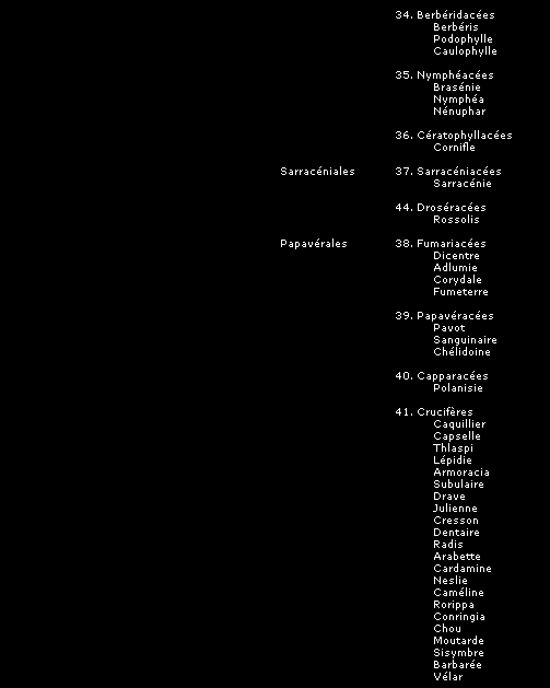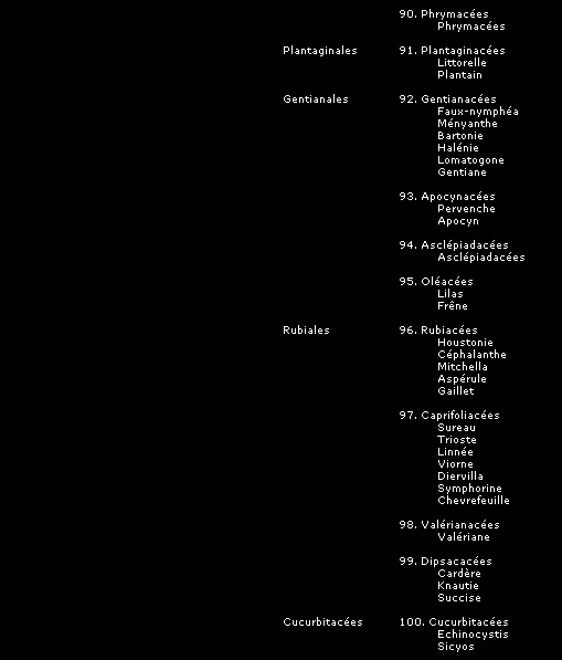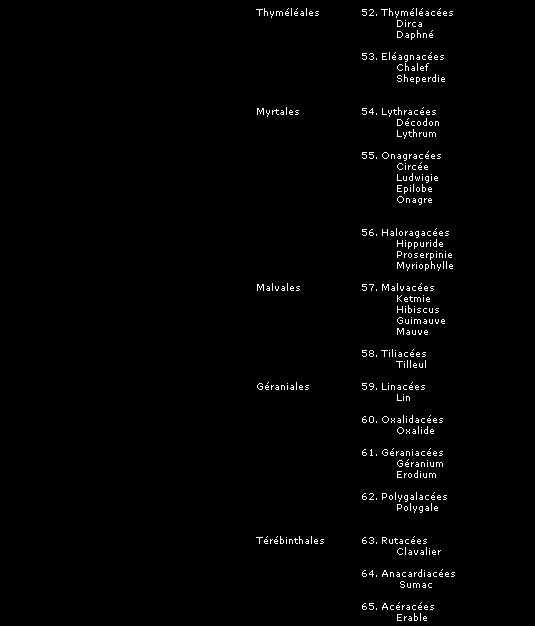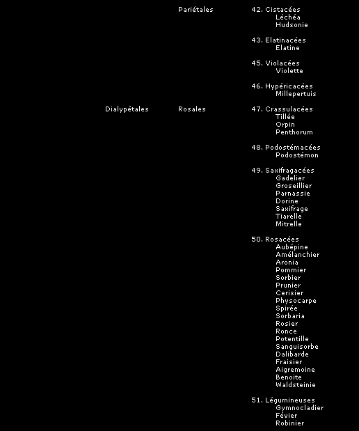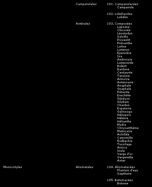 La classification que nous présentons ici, comme toutes les tentatives pour ordonner et définir les groupes de plantes et leurs relations entre elles, peut être sujette à des modifications, mais donne une image fidèle du synopsis établi par le Frère Marie-Victorin dans son ouvrage "La flore laurentienne", assurément le plus exhaustif et le plus remarquable ouvrage consacré à nos espèces québécoises.