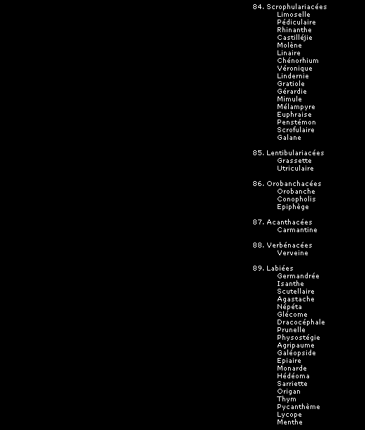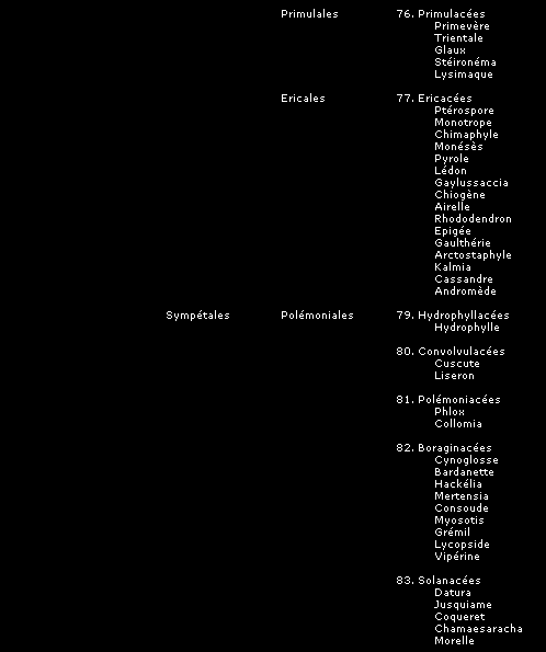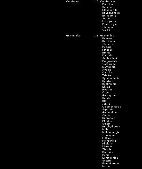 Pour chaque famille de plante, nous avons ajouté la liste des espèces entrant dans chacune des catégories (indiquée en italiques) afin de permettre plus facilement une identification des plantes connues sous leur nom commun.
