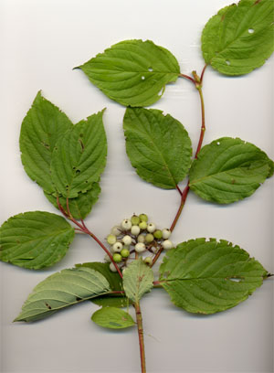 Cette plante, ou plutôt cet arbuste, est celui qu'en hiver on reconnait le mieux, car ses tiges rouges vif sombre, dénudées de leurs feuilles, surgissent hors de la neige en grands bouquets assez denses. Ces tiges qui sont lisses, très compactes, sont couvertes de petits points gris, et d'onglets durs qui ressemblent à des griffes d'animaux. Ses fleurs sont d'une couleur jaune-blanc, elles sont petites, d'une texture laineuse et leur cime est en corymbe. Elles donnent de petits fruits qui sont des baies de couleur bleu vif.
